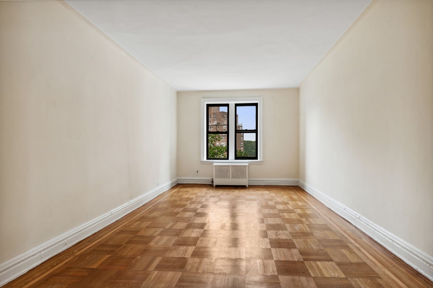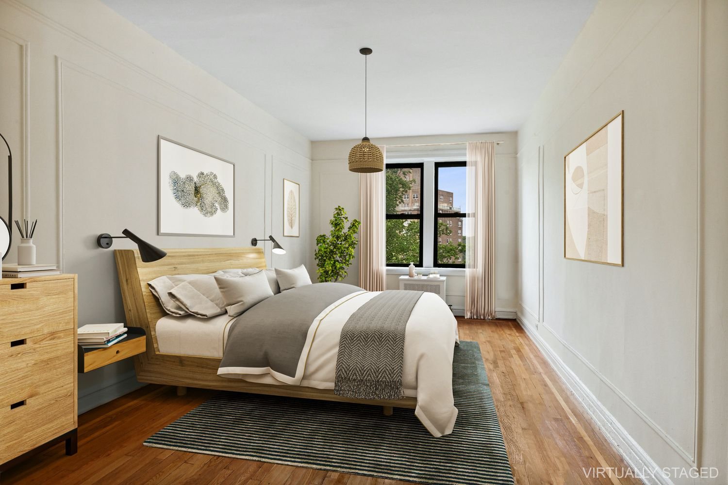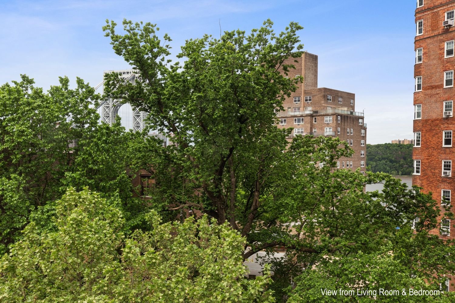 Glorious river breezes flow freely though this home from west to east with tranquil leafy views from every window and even a seasonal peak of the Hudson River and GWB. Beautifully proportioned, this huge prewar one bedroom with separate dining room is as large as many two bedrooms in the neighborhood. So much space to work with, simply bring your vision and contractor to transform this diamond in the rough into a thing of beauty! The inviting entry foyer leads you to an expansive living room flooded with afternoon light and picturesque sunset views; opposite is the dining room and kitchen each facing pretty evergreen gardens and bathed in morning light. The king-sized bedroom is nicely removed from the living space, separated by a hallway with 2 large closets. To have this kind of space AND enjoy the perks of top-floor living is a special opportunity indeed.