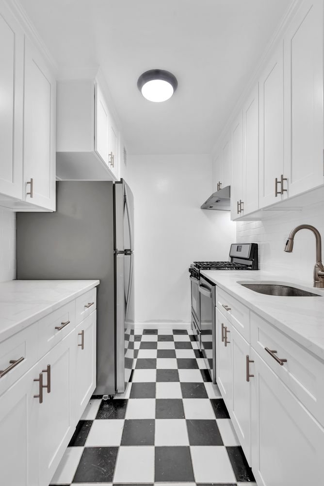 The apartment features a newly renovated kitchen with brand-new full-size stainless steel appliances.
