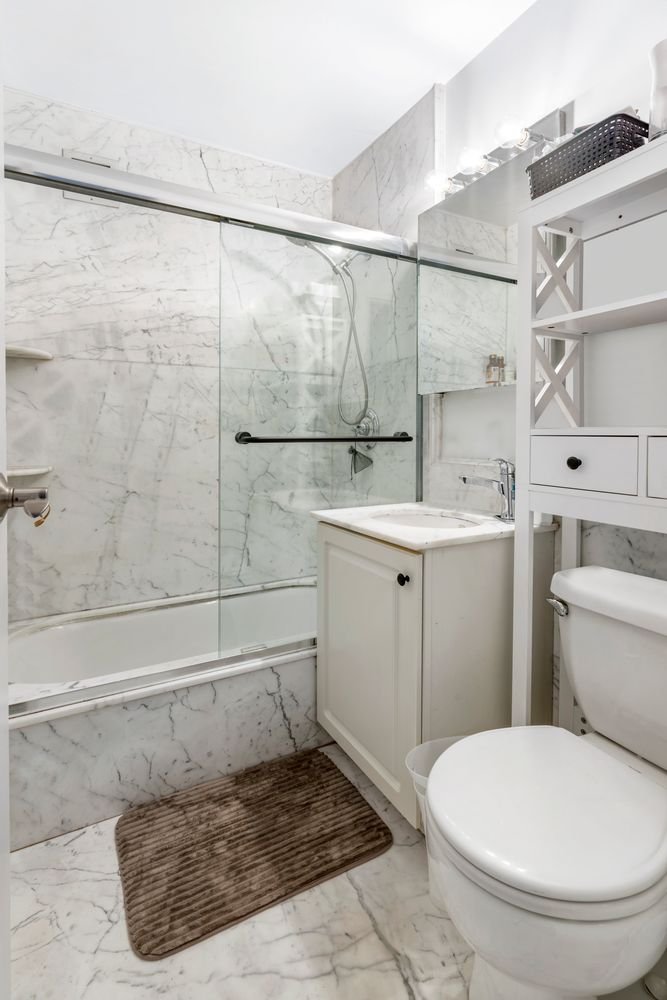 A marble bathroom, 9’ ceilings, windowed air conditioning, and hardwood floors round out the features of this unit.