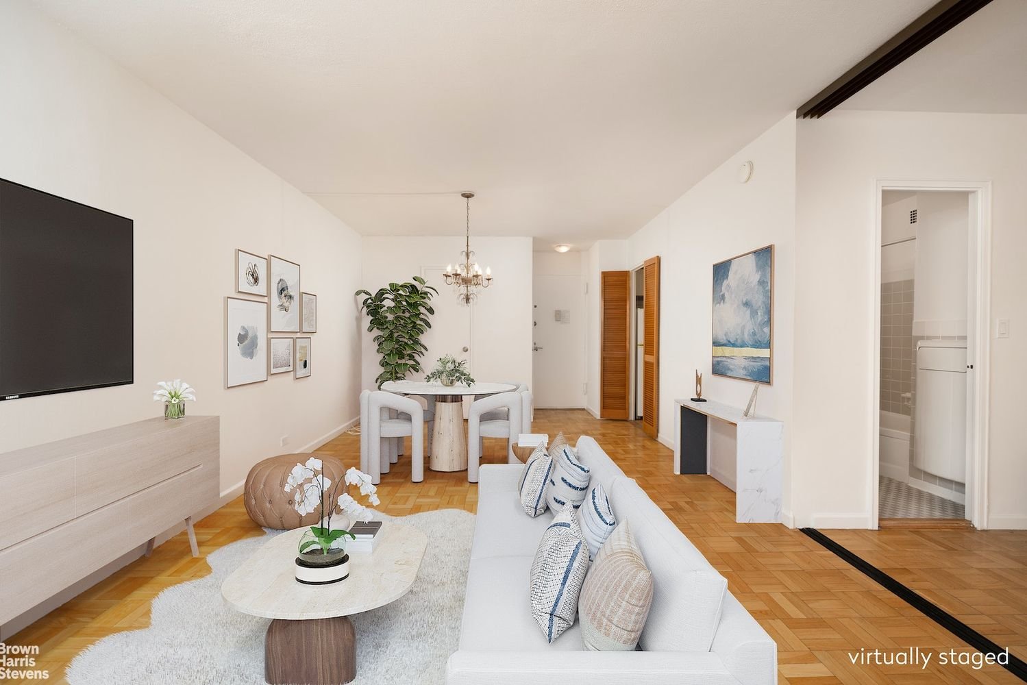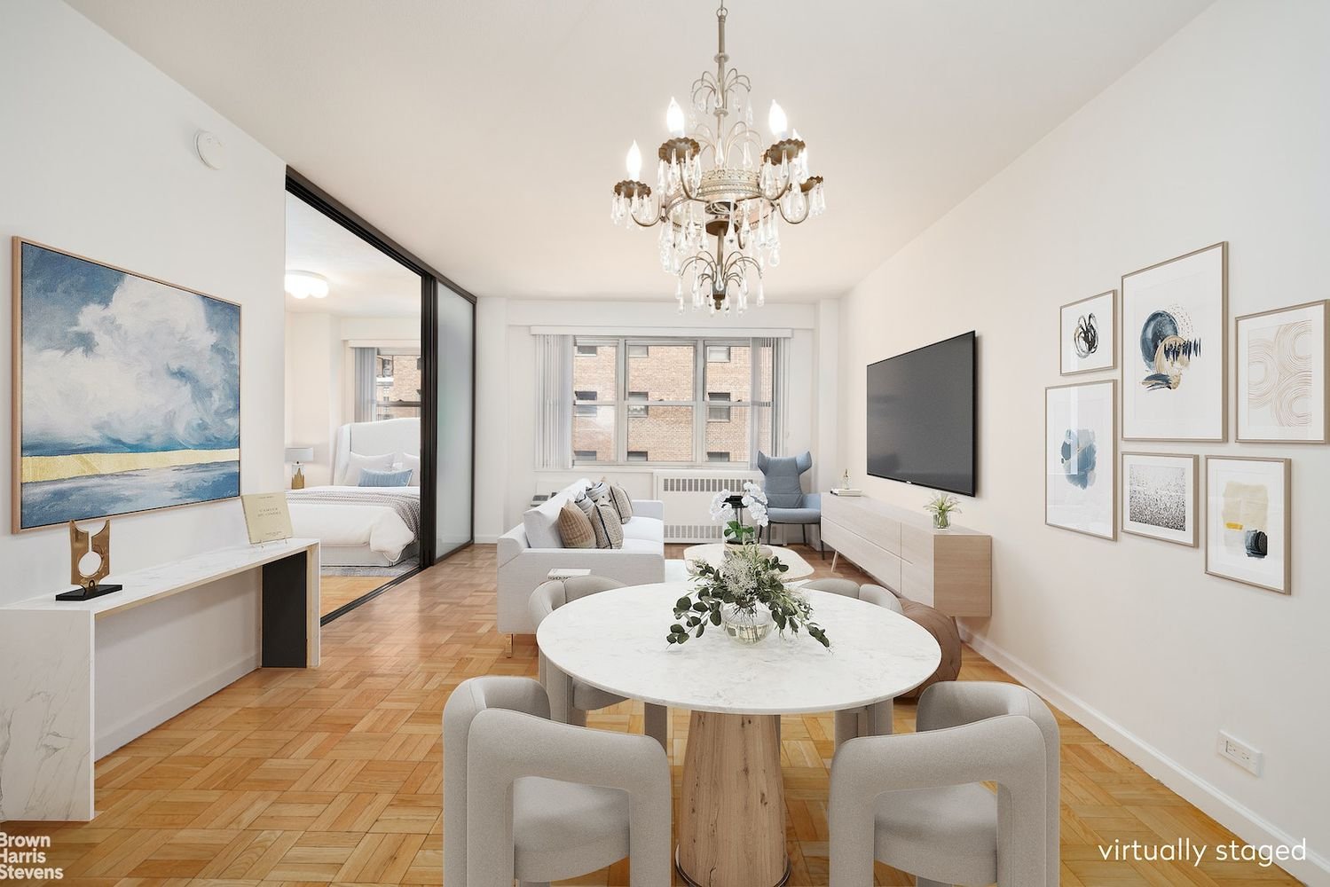 Conv. 1-br, 2 exposures, lots of sun! With a potential to convert to a junior 1-bedroom, this sparkling alcove-studio home shines from natural light pouring in from northern and eastern cityscape exposures over six giant windows. The apartment’s open layout is conducive to entertaining, with separate areas for the kitchen, living space, and sleeping area. You’ll love your floor-to-ceiling, sliding, privacy window panels, to separate your sleeping area from the living area, as well as the installed charming chandelier over the dining area. Organize your life with two entryway closets and another closet in the sleeping area. Relax after a hectic day with a steamy-hot shower in your cozy bathroom! If that weren’t enough, unwind on the spectacular common roof garden, where from any one of 3 relaxing pods you can center yourself, savor a drink, or otherwise just absorb the stunning 360-degree views of midtown Manhattan & beyond – including the Empire State, MetLife & Chrysler buildings, the East River, & Long Island City! From the roof garden after sunset, marvel at the stunning lightshow all around you from your very central location, just a short radius from Manhattan’s most iconic buildings. Find your bliss in prime-residential Murray Hill, treasured for its historic brownstones & calm tree-lined streets. You’re very close to a Citibike station, the 33rd St subway and Grand Central Station (with the 4/5/6/S/7 & Metro-North trains), gyms, shops, Trader Joe’s, gourmet Fairway, restaurants, and nightlife. This full-service, smoke-free, modern, financially-secure co-op has a superb staff, including 24-hour doormen & a live-in super, with an upgraded lobby, hallways, elevators, heating system, and central laundry facility. Other amenities include storage room, bike storage, and Spectrum internet / cable included in the maintenance. (Verizon FiOS is also available through your own retail account.) Co-op Board package, interview, and approval required. Permitted on a case-by-case basis are parents buying for children, guarantors, co-purchasing, gifting, & pied-a-terre. One pet welcomed up to 35 lbs. Subletting allowed after only 1 year of residence, for a fee. A spacious, bright, and cozy home at a dynamic location!