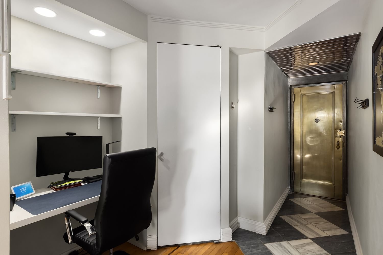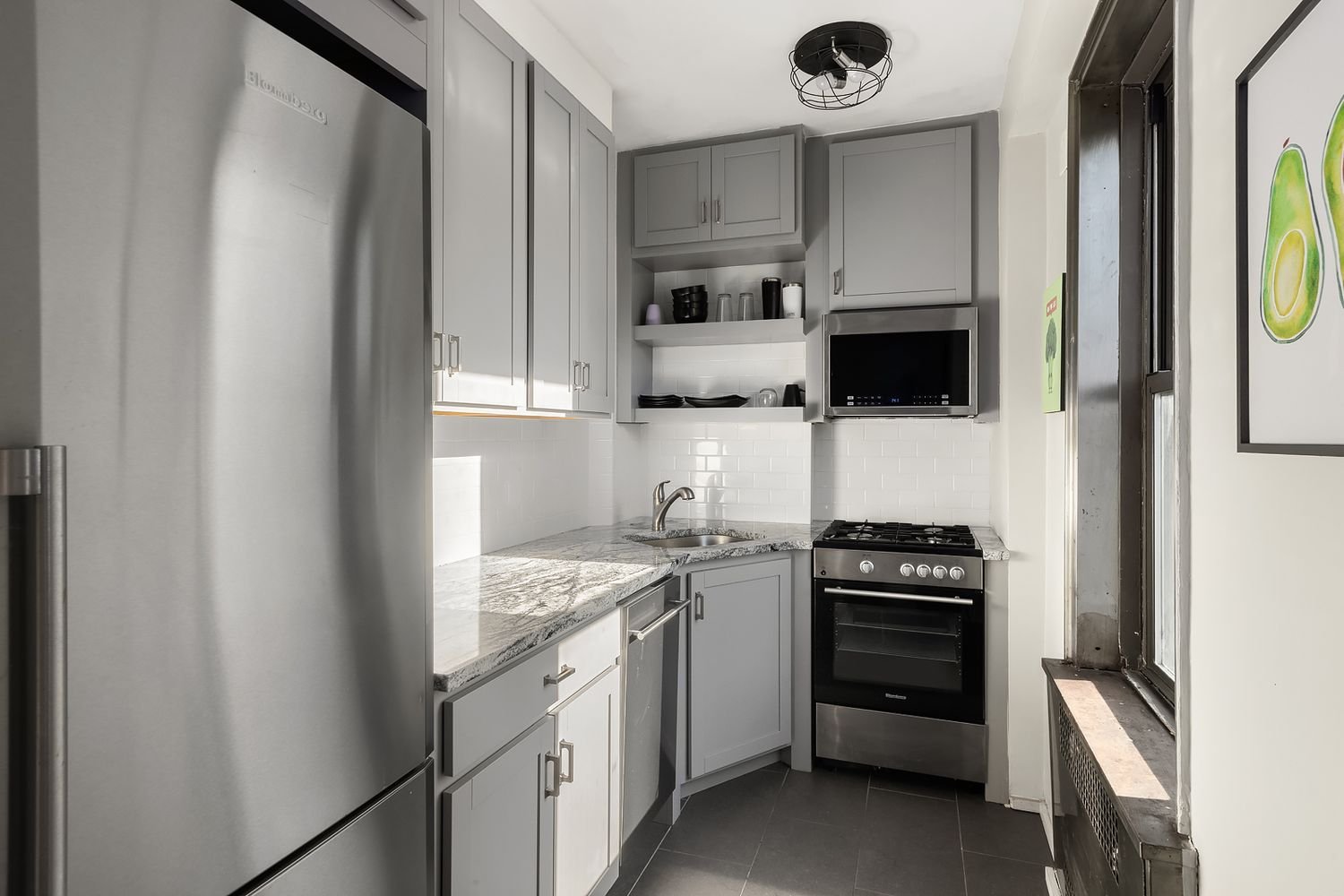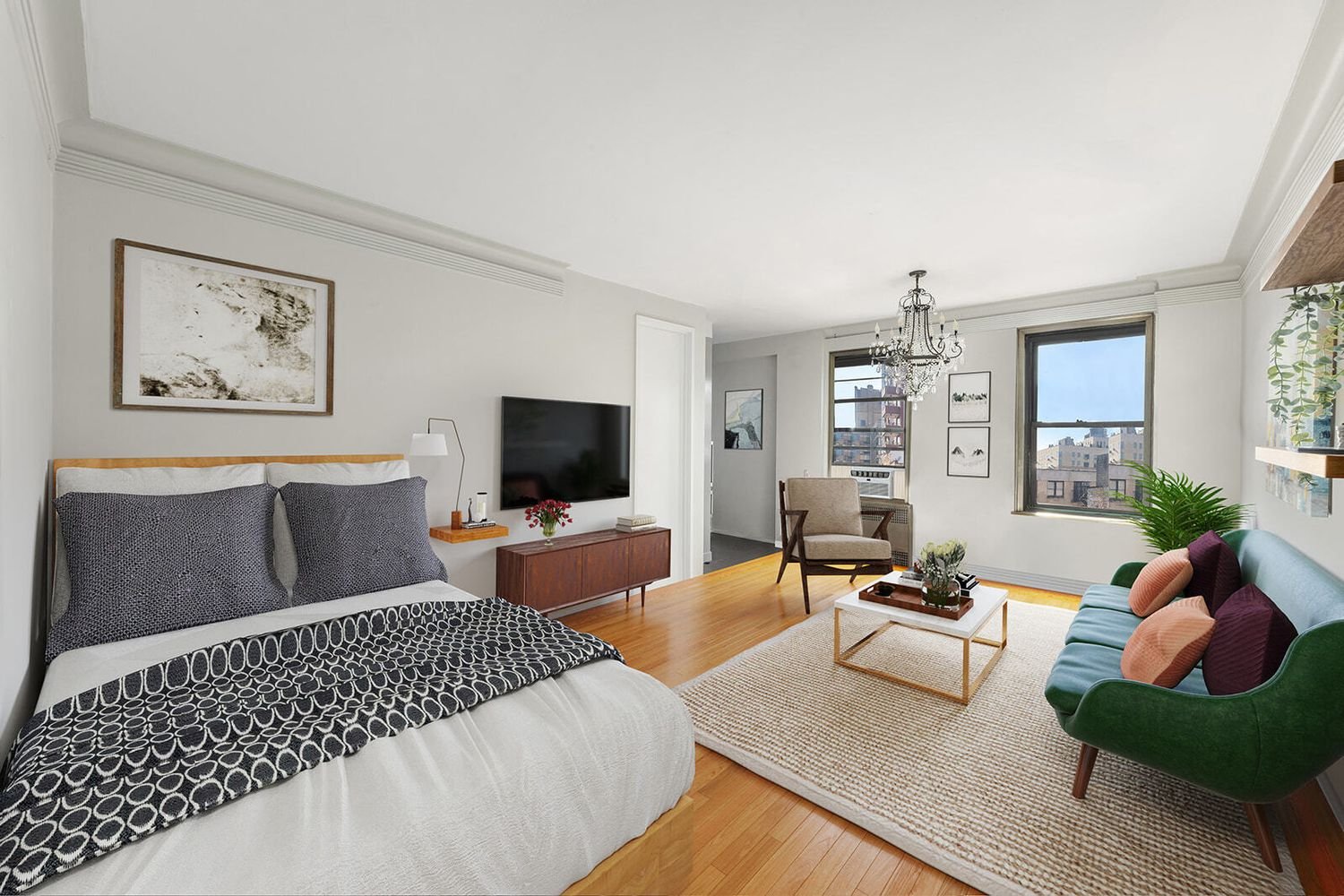 Modern convenience and classic city charm shine in this move-in ready co-op, a recently renovated garden-facing 1-bathroom studio nestled in the heart of Chelsea. Luminous southern light spills through sash windows, illuminating beautiful hardwood floors with border inlays, tall ceilings with crown molding, and a pair of chic chandeliers. This pin drop quiet home begins with a large living, dining, and sleeping space overlooking a tranquil garden. A clever floorplan allows for a windowed alcove kitchen and a distinctive home office with a built-in workstation. The kitchen is adorned with sleek granite countertops, a white subway tile backsplash, tiled floors, custom cabinets, and high-end stainless steel appliances including a dishwasher, microwave, and gas stove. The bathroom has a linen closet, white tilework, and a lovely pedestal sink. A deep storage closet completes the home.