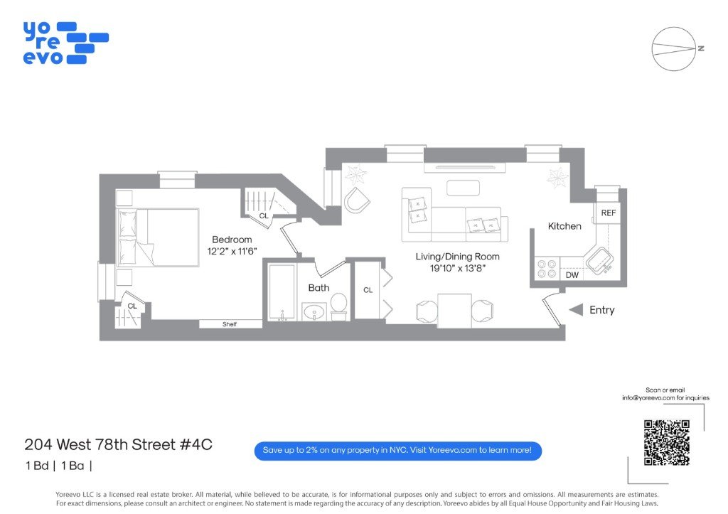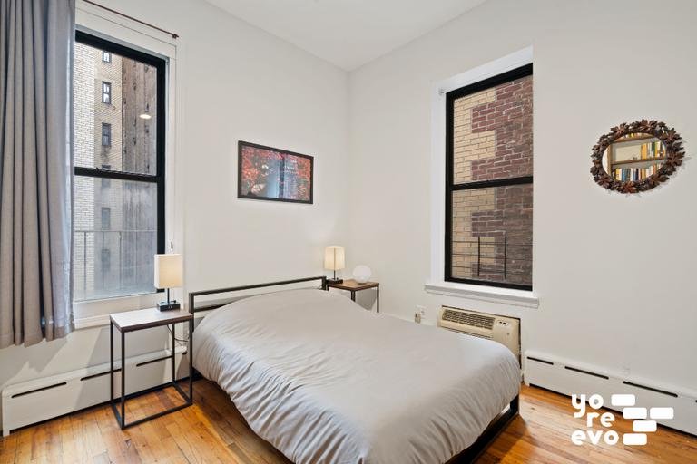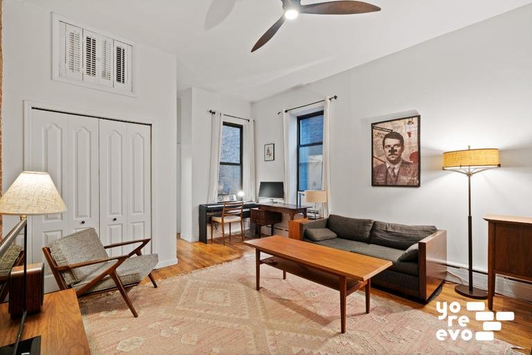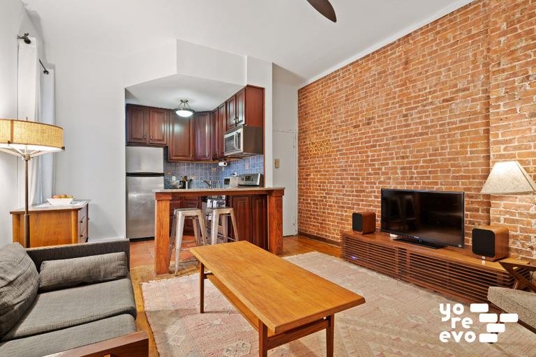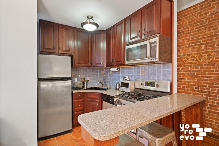 The perfect Upper West Side one bedroom! Apartment #4C checks every box – high ceilings (over 10 feet!) , exposed brick, open kitchen, plenty of closet space, renovated bathroom and every room is generously sized! The apartment (and bedroom in particular) are at the back of the building so its pindrop quiet and there are six windows along two exposures. The building is located right in the middle of the quintessential Upper West Side. The American Museum of Natural History is down the street, Fairway and Zabars are around the corner and it’s sandwiched between Central Park and Riverside Park. Getting around is a breeze with the 1 train and crosstown bus down the block and the B and C trains a few minutes away. 204 West 78th Street has laundry in the basement and allows one sublet after two years of residency. There is no flip tax. Pied-a-terres, co-purchasing and guarantors are not allowed. All dimensions are estimates. We support Fair Housing.