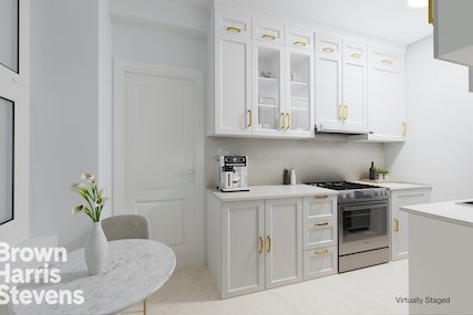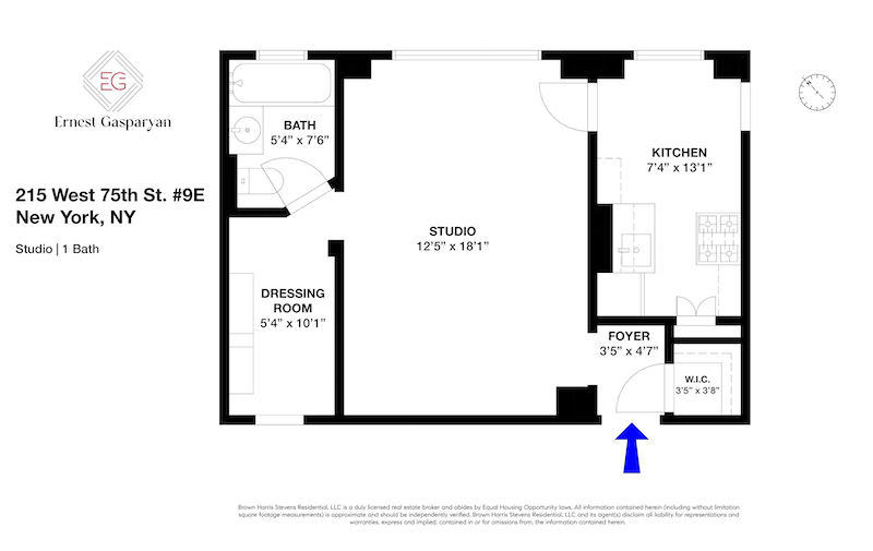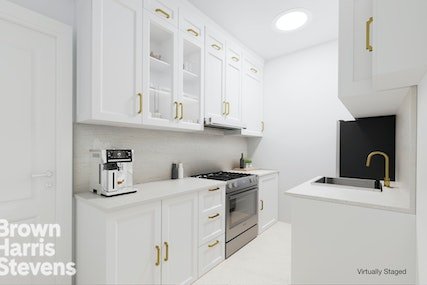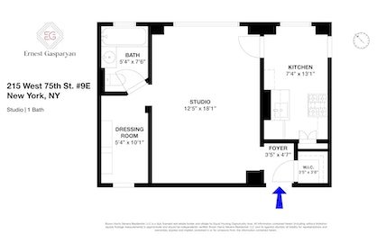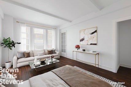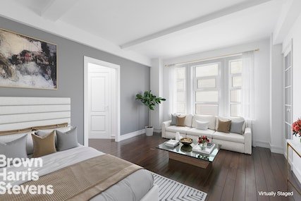 Sponsor unit. No board approval. Apartment 9E is a spacious Studio with a separate dressing room that can be used as a home office or can be opened up into a sleeping alcove. The layout of this apartment is flexible and can be designed to meet your needs. There is a large walk-in closet, high beamed ceilings and large windows including in the bathroom and in separate eat in kitchen. The Majestic Towers is perfectly located on West 75nd street between Amsterdam and Broadway, near both parks, subway on W72 and Broadway 1,2,3 trains, Trader Joe’s, Fairway supermarket and all the fabulous restaurants and stores within a few blocks. This is a pre war elevator building with part time doorman (8am to 1:30am), live in super, laundry room and roof deck. Storage and bike storage available in the building (subject to waitlist and additional monthly fees). In unit Washer and dryer installation is allowed with board approval. Wall through a/c installation is allowed with board approval. Please note this is a sponsor unit, no board approval required for this particular unit. Pets welcome! Maximum 80% financing. Maintenance $1,182.66. PLEASE NOTE: the images have been virtually renovated and staged to better showcase the true potential of rooms and spaces in this apartment. Showings are by appointment only through the listing agent.