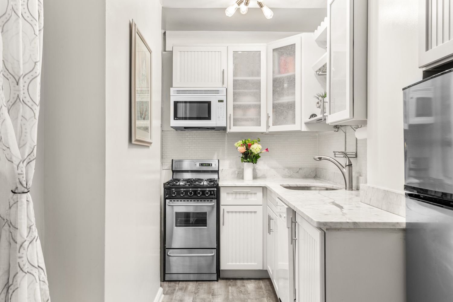 Upon entering this spacious residence, you will find a gorgeous entryway with room to sit and plenty of closet space. A series of steps bring you down to the sunken living room area with space for a full-sized sofa and seating. The adjacent sleeping alcove features a low dividing wall for privacy and can fit up to a king-sized bed. Enjoy a fully-renovated windowed kitchen with abundant custom-made cabinetry, marble countertops, newly-installed vinyl plank flooring, mosaic tile backsplashes, microwave, dishwasher, and stainless steel appliances. A separate marble counter is perfect for working from home or dining. The windowed bathroom is fully-renovated and includes a classic large tub/shower, newly-installed vinyl plank flooring, and large vanity. Refinished original parquet floors throughout. Everything is ready for you to move in!