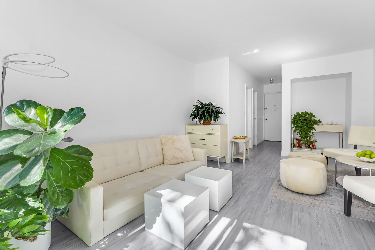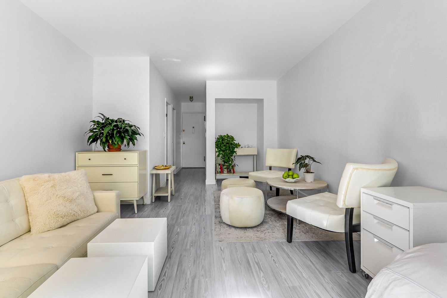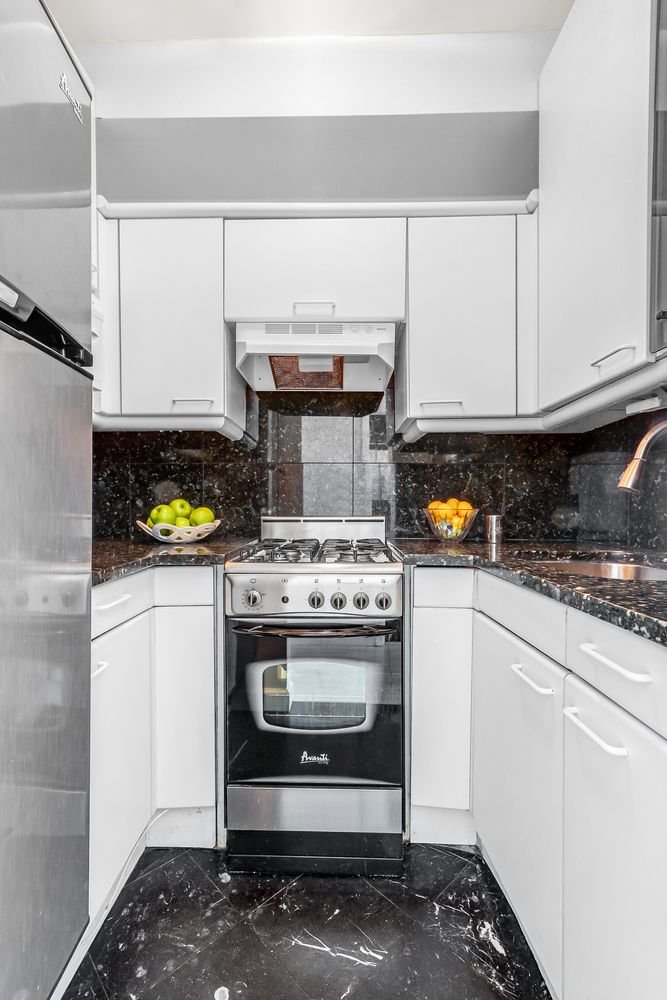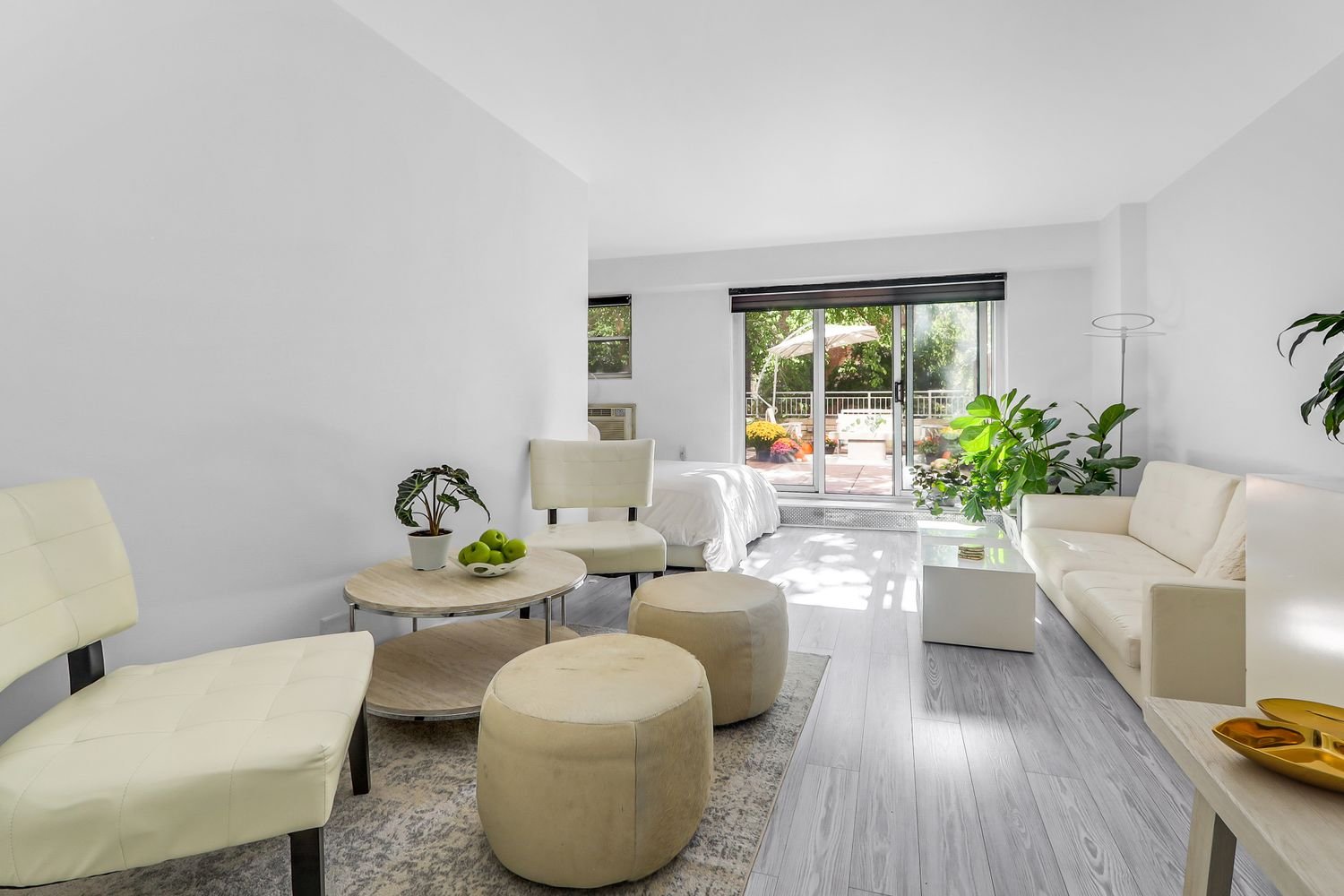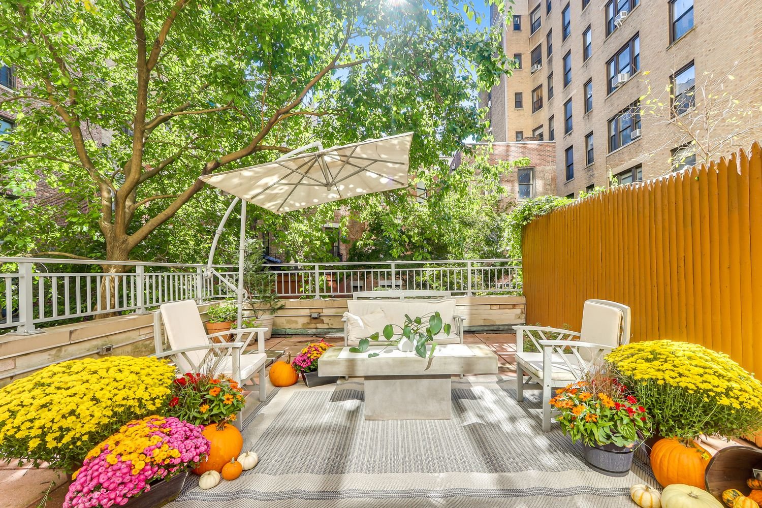 This Mid-Century home has a classic soul with a contemporary edge. Underfoot are wonderful wood floors. Walls of South-facing windows in both the living room and sleeping area showcase this upgraded beauty’s picture perfect, leafy views onto of one of NYC’s more picturesque private terraces. Off of the stretch-out living room, with that verdant view, is an over scaled, al fresco dream space — an elevated sky-yard — surrounded by a big tree and cozy architecture.