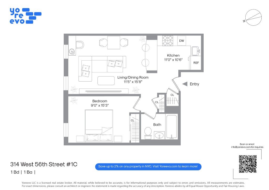 Please note this is on the second floor of the building. Tons of potential awaits you at 314 West 56th Street #1C, located in the heart of Midtown and steps from Central Park! The apartment features the ideal layout with an oversized, open kitchen, ample closet space (including built-ins in the bedroom) and a sizable living room. 314 West 56th Street is a well maintained co-op with a beautiful roof deck, laundry in the basement and the 1, A, C, E, B, D, N, Q, R, W trains are all within a few minutes. Columbus Circle (including Whole Foods!) is three blocks away and there are tons of new restaurants in the Turnstyle Underground Market (accessible from 57th Street which also makes getting to the 1, A, C, B and D trains a breeze!). Pied-a-terres, guarantors, co-purchasing and gifting are allowed on a case by case basis. Pets are allowed and subletting is allowed for 2 out of 5 years after 2 years of residency. There is a 1% flip tax payable paid by the seller. Two photos have been virtually staged. All dimensions are estimates. We support Fair Housing.