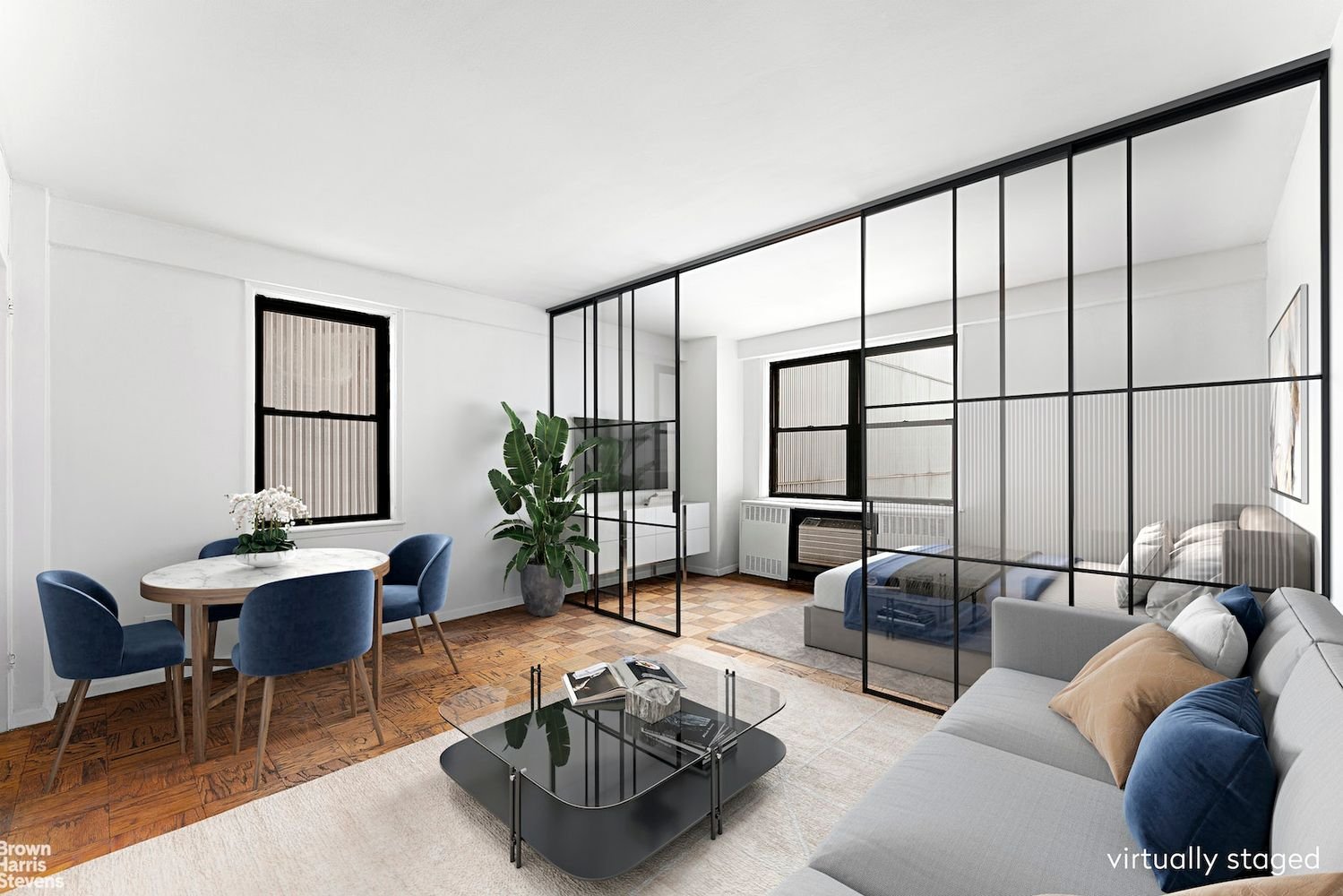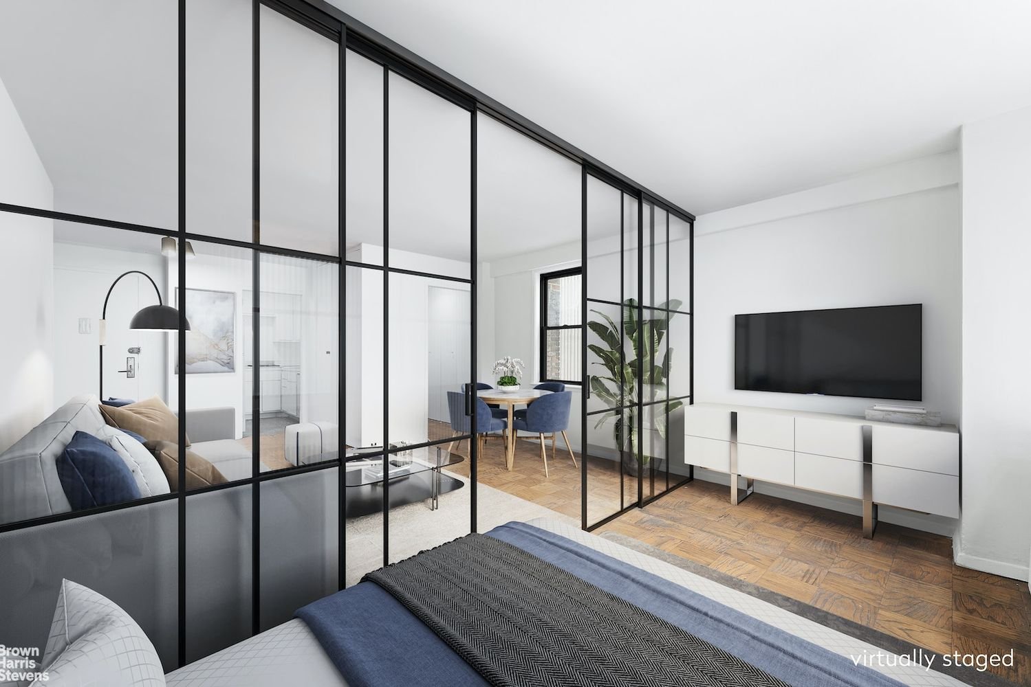 Pin drop quiet oversized corner studio with double exposures and direct views of the Chrysler Building. This “diamond in the rough” needs TLC and is easily convertible into a junior one bedroom. It has a spacious open layout, windowed bathroom, an abundance of storage including an enormous walk-in closet, dressing area and entry foyer. Large galley kitchen has ample counter and cabinet space with a separate pantry. Located in one of Gramercy North’s best full service buildings. Features include live-in super, 24hr door attendant, great staff, new: hallways, lobby, mail & package room and laundry facilities. On-site garage. Bike & storage room available. Centrally located near major routes of transportation, 3 parks, nightlife, the best restaurants, shopping and all conveniences. Co-purchases, pied-a-terres and dogs up to 40lbs permitted. Subletting allowed after two years ownership for up to four years. Resident building specialist on site available to answer any questions.