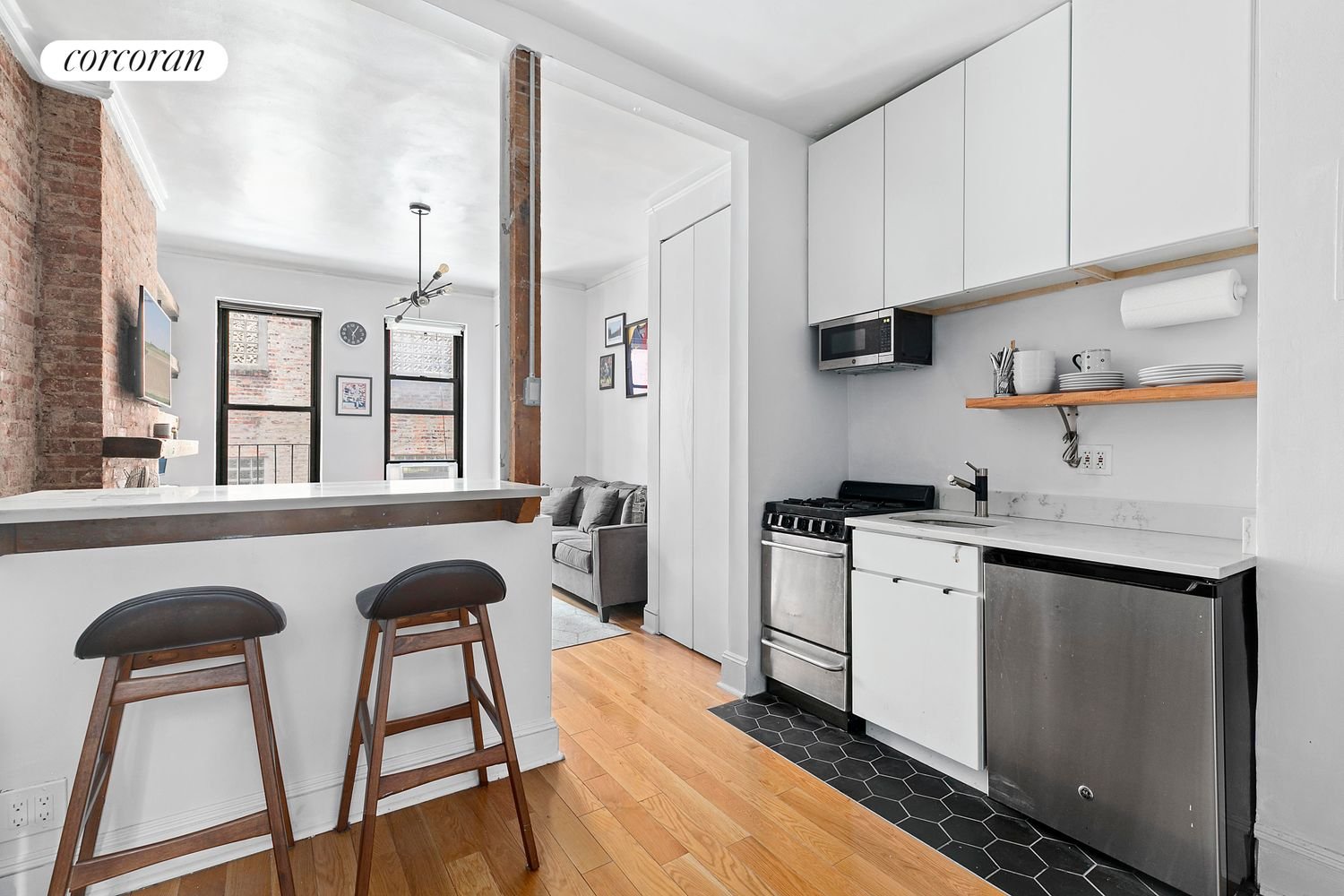 Apartment 12A is a recently renovated spacious one-bedroom apartment located on a treelined block in the Upper East Side. With over 9 ft ceilings and new oak floors, the sunny southern exposure lights up the living room, with beautiful exposed brick and decorative fireplace. The living room flows seamlessly into the large eat-in kitchen featuring a stainless-steel appliances and new quartz countertops. The large island can easily sit 4 people and the kitchen is large enough for a table as well. With custom shelving and cabinets, there is plenty of storage space. The high ceilings continue throughout and into the windowed bathroom and quiet north facing bedroom. Washer/dryer permitted and can be easily installed. The apartment also comes with a 6×6 private storage unit. 336-332 East 77th Street is a beautiful red brick co-op comprised of three buildings and 57 units. The building recently did an interior and exterior renovation, restoring the hallways and outside fa ade. Built in 1910, this intimate, well-established pre-war coop is located close to shopping, restaurants and the M79 crosstown bus/6 train on East 77th Street/new Q train on East 72nd Street. Live-in super. Parents buying for children, gifting, and co-purchasing are allowed. Sorry, pets and pieds-a-terre are not permitted. The maintenance is 64% tax deductible and the new owner can apply for STAR (School Tax Relief Credit).