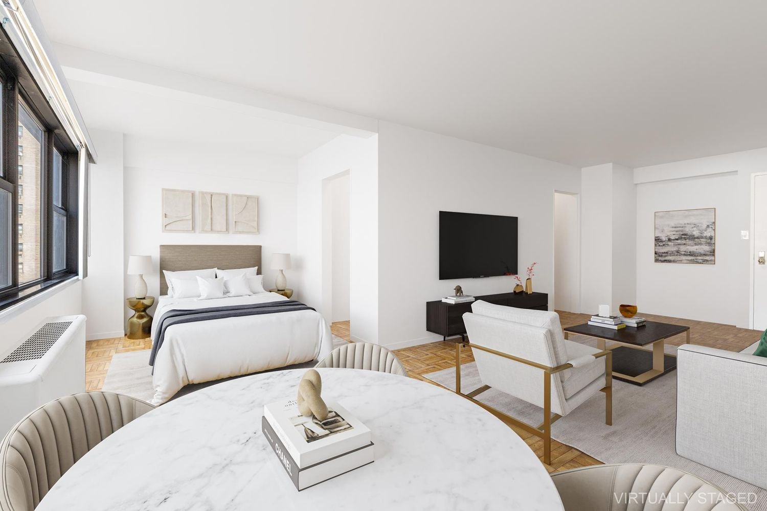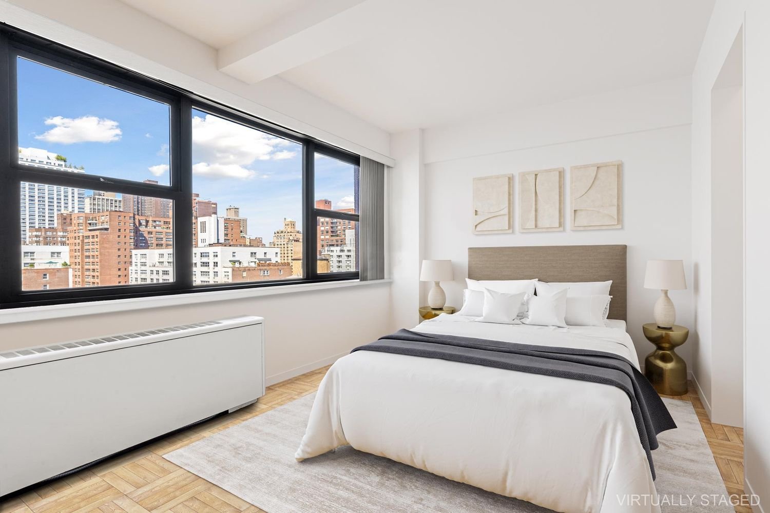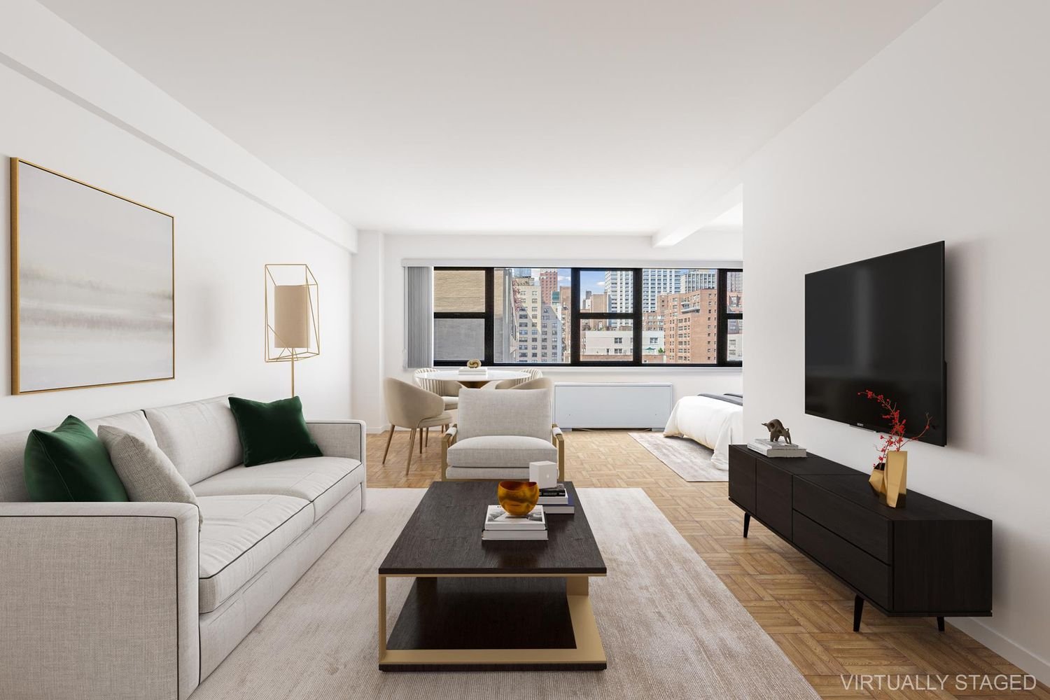 Sutton Area Alcove Studio Huge triple mint alcove studio converts to a junior one bedroom. Beautifully renovated quiet and bright home with wall of west facing windows overlooking the landscaped garden. The dramatic 29-foot living/dining room offers many options to reconfigure including space for a home office! The top-of-the-line kitchen features lacquered cabinetry, stainless steel appliances and generous storage space. The large sleep alcove easily accommodates a queen bed and side tables. And the renovated bath has top-of-the-line finishes. Other features include wide plank floors, custom outfitted closets with new doors and a PTAC unit. Low monthlies and 80% financing allowed! Guarantors and co-purchasers permitted. Pets allowed with board approval. The Sutton East is a full-service co-op with doorman, resident manager, landscaped rooftop deck, central laundry and bicycle room. Ideally located in midtown’s Sutton Place, close to mass transit, retail including T. J. Maxx and Saks Off Fifth and many of the city’s finest grocers including Whole Foods and Trader Joe’s!