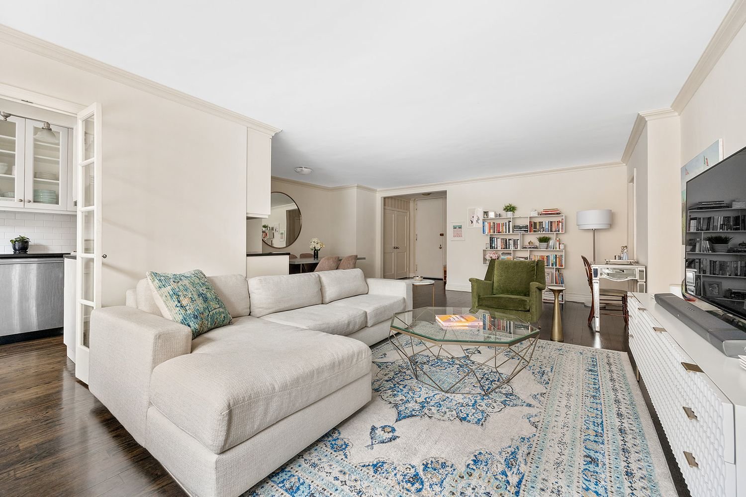 The wide entry foyer with large closets on either side leads you to the bright airy, sun-filled and pin-drop quite living area. The large, windowed kitchen with French doors features modern stone countertops, hardwood flooring, Sub-zero refrigerator, Viking range and hood and a Bosch dishwasher. The Master bedroom is large enough for a king bed, features custom closets and a fully updated master bath with enormous walk-in shower. The second bedroom is large enough to serve as a guest room and home office. The second bath opposite the bedroom is completely updated with a deep bathtub.