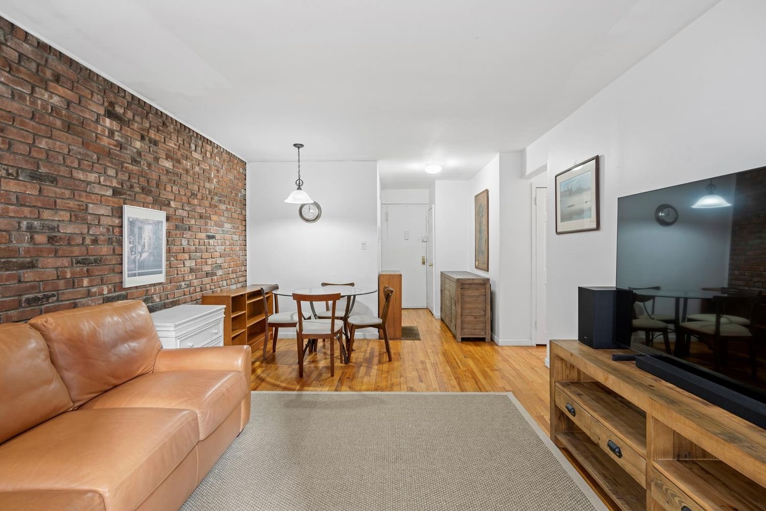 Welcome home to this move-in-ready 1-Bedroom apartment in an elevator building on the Upper East Side. As you enter apartment 3A you are greeted by a nice coat closet and comfortably sized kitchen. The kitchen has a full-sized refrigerator, a dishwasher, and an oven, with plenty of room to cook at home, as well as tons of storage space. Your large living room has space for a comfortable-sized living area, as well as a separate dining space. Beautiful wood floors fill the apartment, and the living room has an amazing original brick wall creating a lovely atmosphere in the home. The spacious bedroom has room for a king-size bed and dresser, as well as a nice-size closet. There is a Hunter ceiling fan in the bedroom. The windows in both the living and bedroom face south on an extremely quiet private outside yard. There are new Air Conditioning Units in both rooms. This home has closets in the hallway giving the owners a good amount of storage space. Apartment 3A has a video intercom. 430 East 77th Street is a beautiful postwar co-op elevator building where residents enjoy low monthly maintenance, video security, intercom entry, a live-in superintendent, and shared laundry in the basement. Located on a beautiful tree-lined street and surrounded by outdoor options including Central Park, John Jay Park, and the East River Esplanade. The 6 & Q trains, bus stops, and CitiBike stations are all within easy reach. The building has an excellent extremely responsive resident manager. 80% financing is allowed. There is a 1% Flip Tax on the apartment. Sorry, no pets are allowed. Subletting is allowed after three consecutive years of using the apartment as a primary residence. Co-purchasing, guarantors, gifting, and pied-a-terre allowed on a case-by case basis.