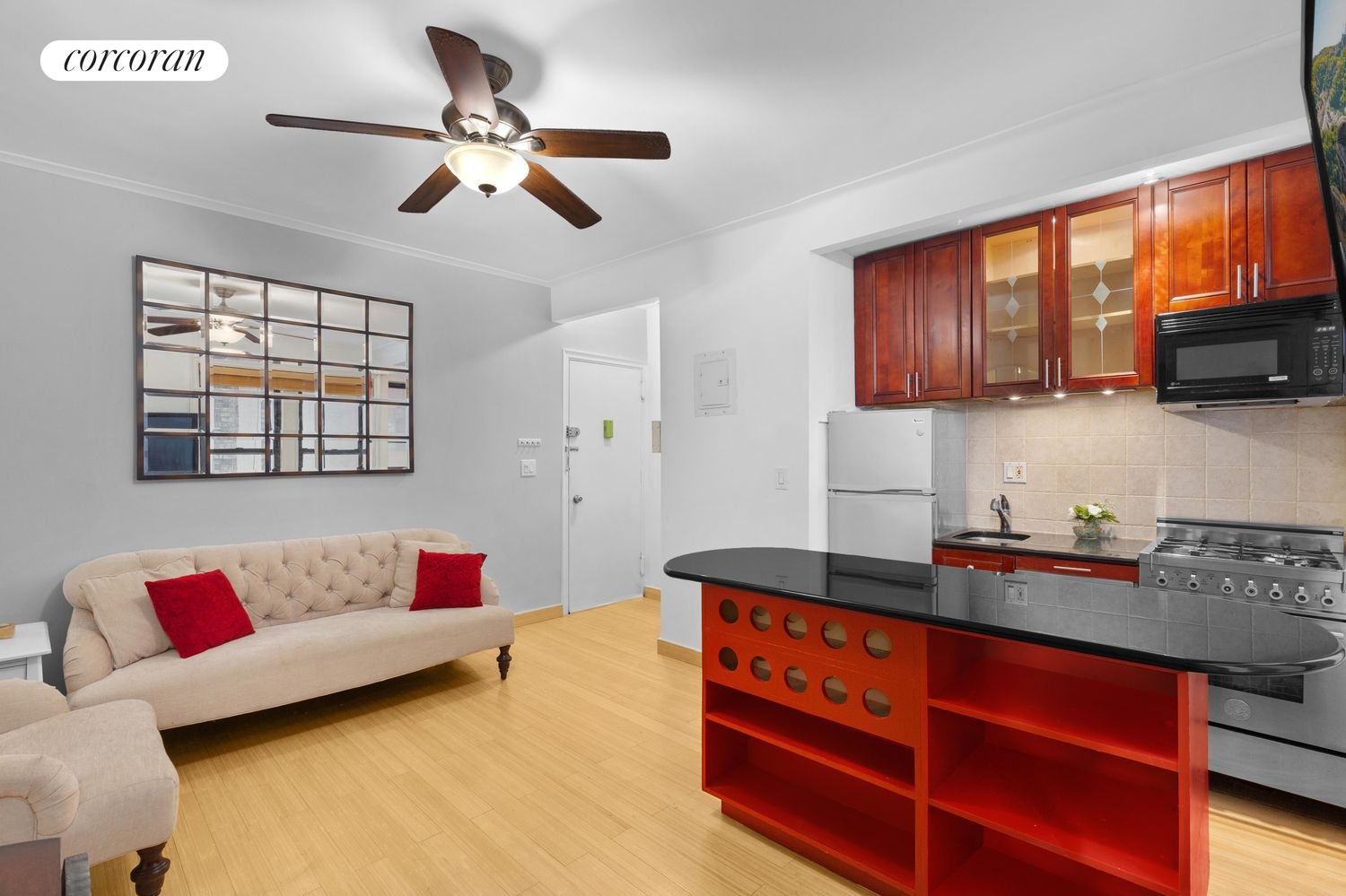Beautiful one bedroom unit in a lovely Hell’s Kitchen pre war elevator building. This unit has been updated with granite counter tops, stainless steel appliances and bamboo floors throughout. The layout of this apartment is very practical. The living room has plenty of space for a full living room set and dining area. The open concept kitchen with breakfast bar allows for additional storage, shelving and wine rack. High ceilings through out and both the living room and bedroom have ceiling fans and overhead lighting installed. The bedroom faces south and gets plenty of natural light and is large enough for a king sized bed and plenty of furniture. There are three very large closets in this apartment. Gifting; co-purchasing & pied a terre’s allowed sublet policy – 1 year of residency and then can sublet 4 out of every 5 years Building FeaturesLive in Supt, landscaped garden, roof deck, elevator & laundry. Conveniently located to all transportation including, restaurants row, the theatre district & times square.$187.59 – monthly assessment