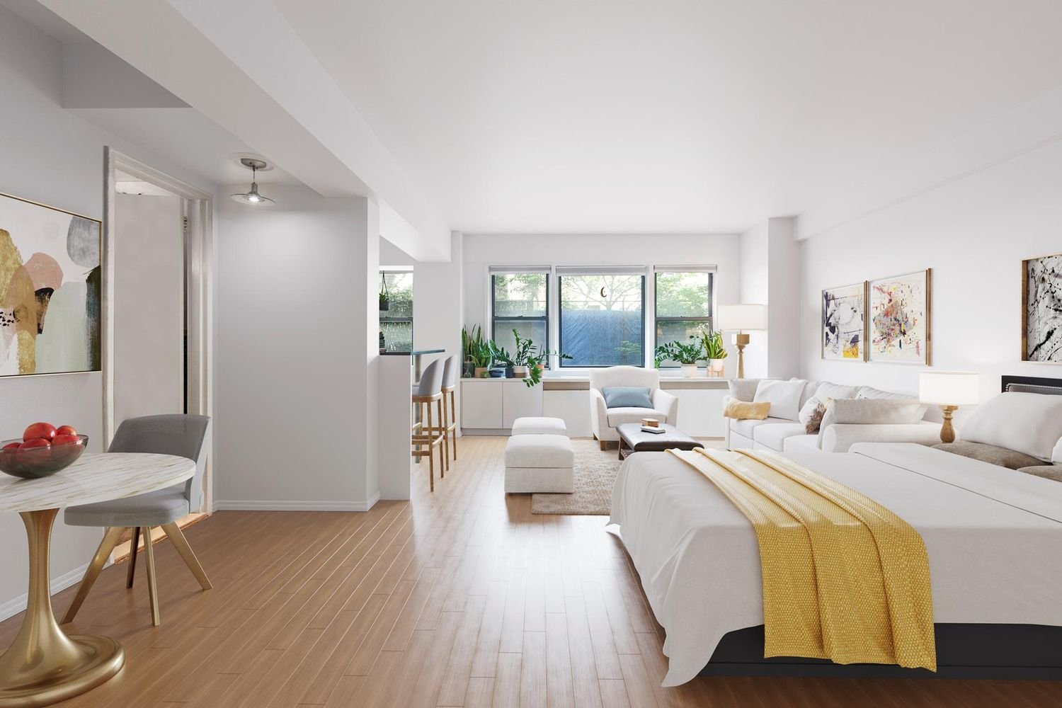 Charming Bright Greenwich Village Studio with Garden Views! This serene and spacious apartment faces north through a wall of oversized windows boasting lovely light and a garden exposure. There is a renovated windowed kitchen and a sizable bathroom. Details of the home include three large closets, hardwood floors and thru-the-wall AC & Heat. Dishwasher permitted with board approval. The Jefferson is an elegant 14-story cooperative built in 1964 with 173 units. Building amenities include a full-time doorman, live-in superintendent, bicycle storage, and a laundry facility. 75% financing permitted. Pied-a-terres, guarantors, co-purchasing, and pets are permitted on a case-by-case basis with board approval. Please Note Special Assessment $114.95/Mo. until 06/2023.