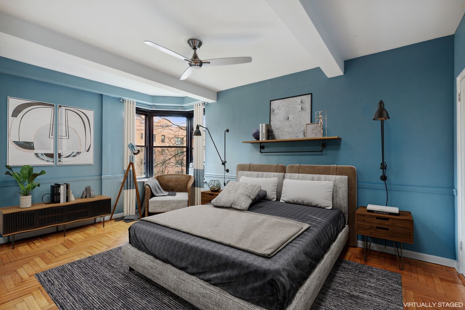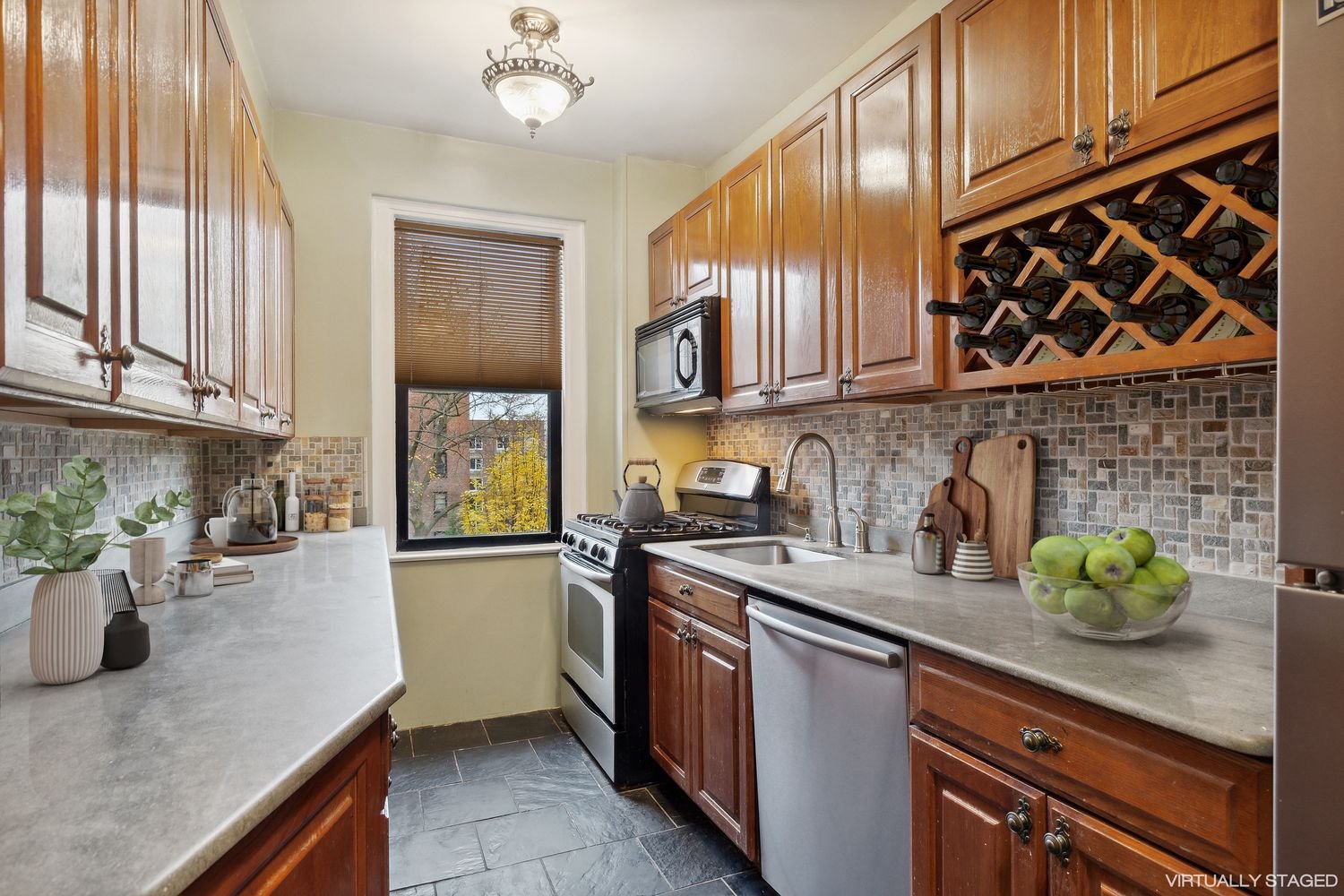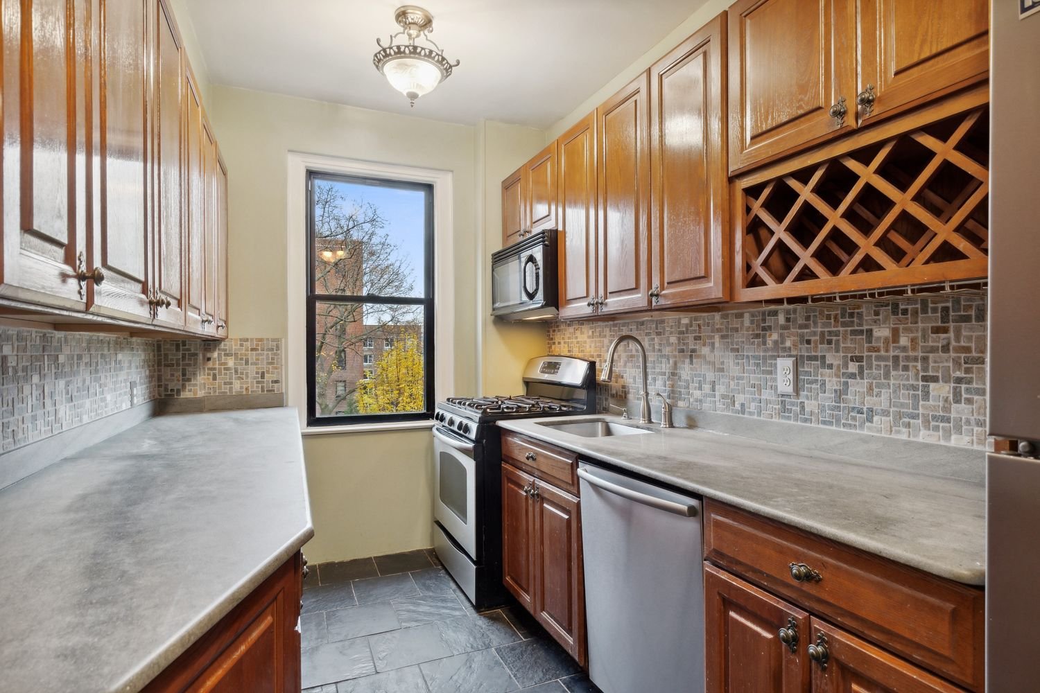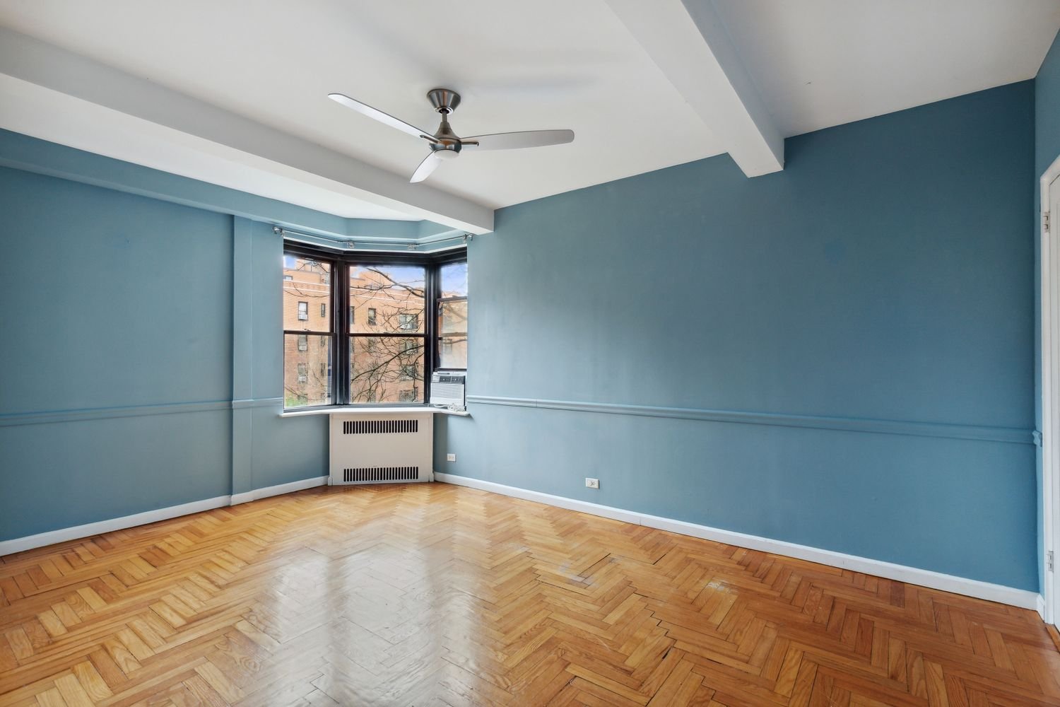 HOME should be a sanctuary; a peaceful retreat that is yours alone, full of beauty and privacy. In NYC that is often hard to find, but this gem is the antidote to the stress of the day. A welcoming foyer ushers you to a sunken living room bathed in nature and glorious light with space aplenty for relaxation and home office. The large, windowed kitchen offers stainless appliances including a dishwasher, plenty of storage and space for meal prep, granite counters and decorative tile backsplash. Nicely tucked away from the entertaining space is the king-sized bedroom, beautifully adorned with a triple corner window overlooking bucolic gardens. The bathroom is simply done in white and grey ceramic tiles, pedestal sink and soaking tub with glass shower doors. Throughout are herringbone floors, amazing closet space and a dressing area separating the bedroom and bath. Not only is this one of the largest one-bedroom lines in Park Terrace Gardens, it’s also surrounded by open sky and nature making this home immensely alluring.