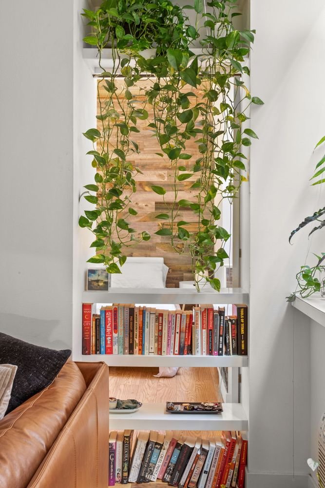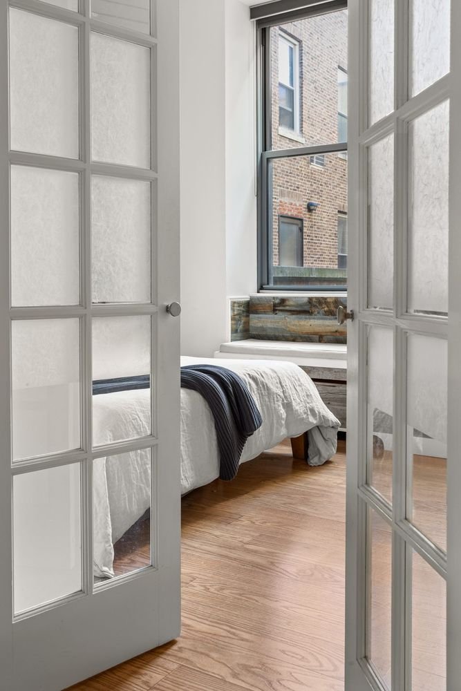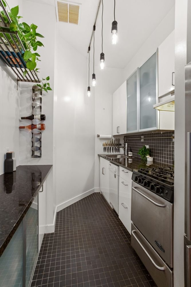 Duas características únicas da unidade são: uma grande porta de resina deslizante, que permite fechar a cozinha ou a alcova de escritório/sono conforme necessário, e a parede “peek-a-boo” que separa um canto do quarto da sala.