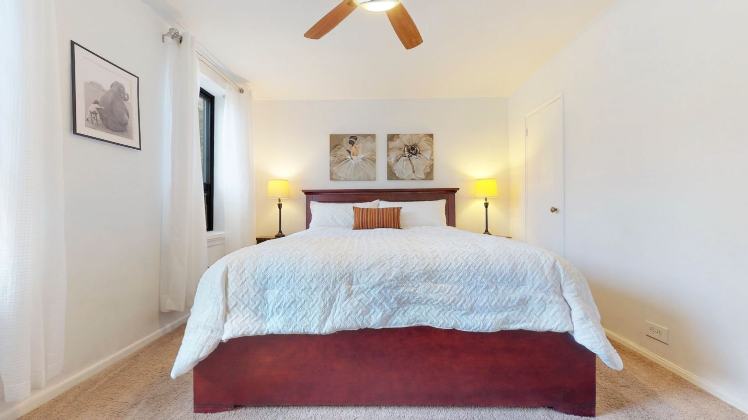 Na área íntima, o quarto principal é espaçoso e conta com dois armários, ventilador de teto, dois conjuntos de janelas e vista para copas de árvores.