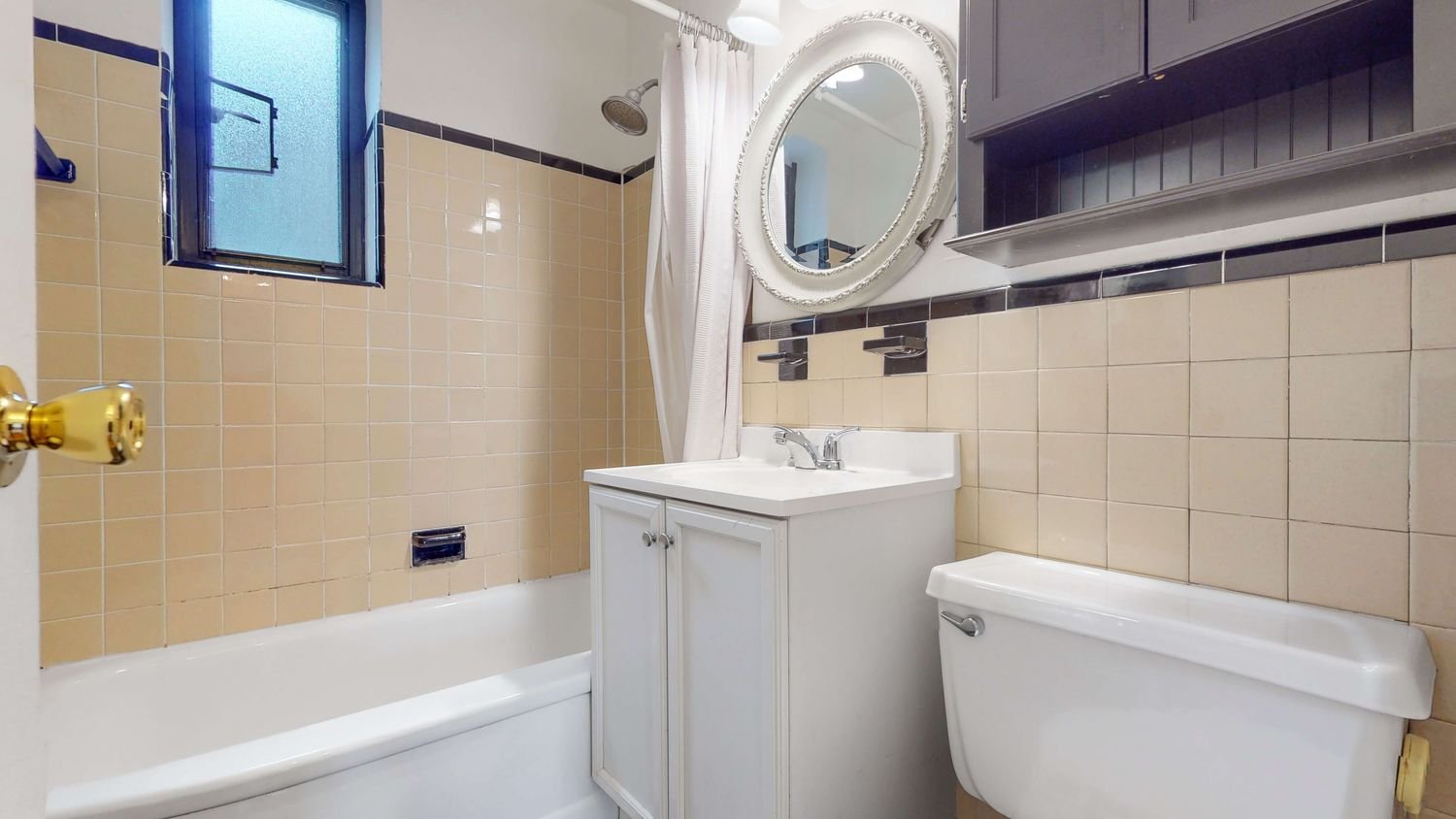 O banheiro, super charmoso, tem piso em azulejo, banheira profunda com chuveiro combinado, bancada de granito branco e belíssimo revestimento de parede em dois tons.