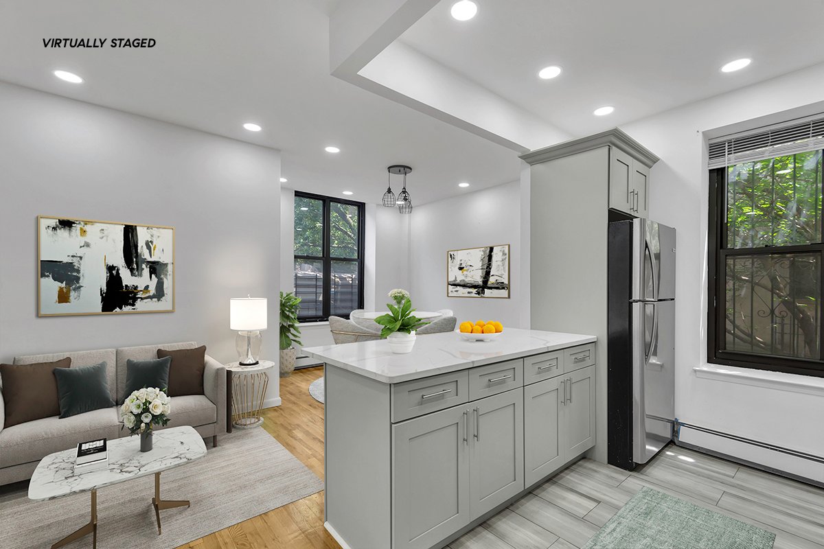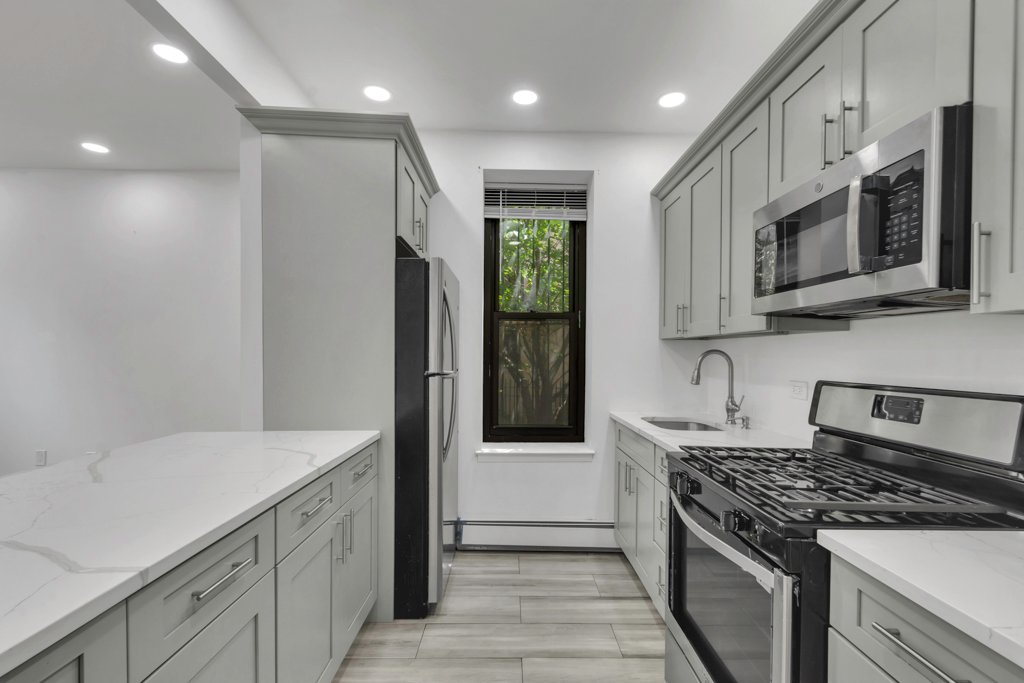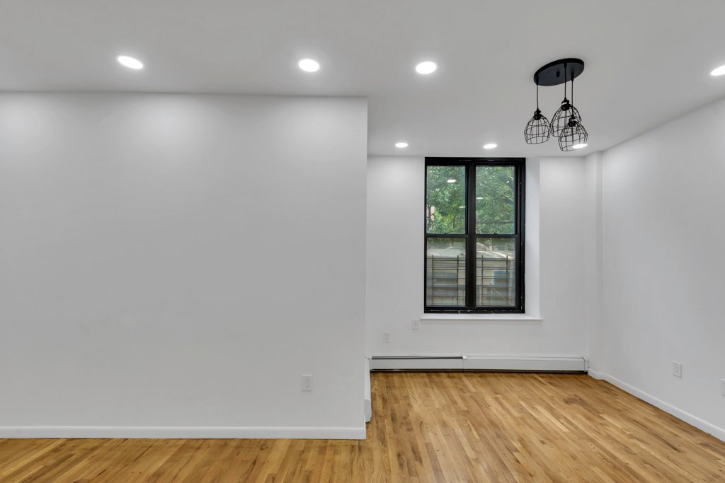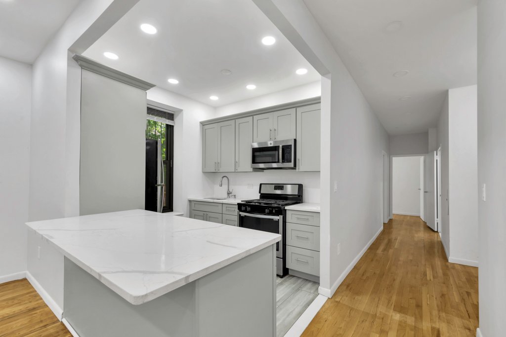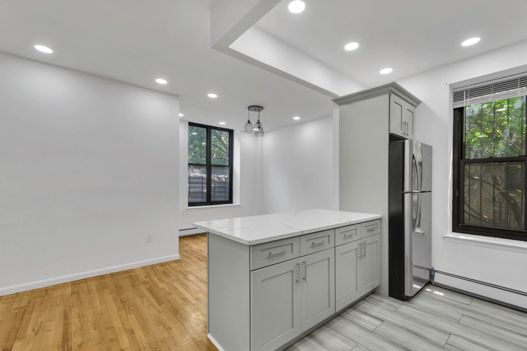 Casa de 2 quartos/1 banheiro no primeiro andar, inteligentemente renovada, na Madison Avenue HDFC, Central Harlem, perto da Quinta Avenida. A cozinha em plano aberto com janelas possui uma grande ilha com bancada de granito e eletrodomésticos de aço inoxidável, ótimos para refeições casuais. O novo banheiro dispõe de box amplo de largura dupla.