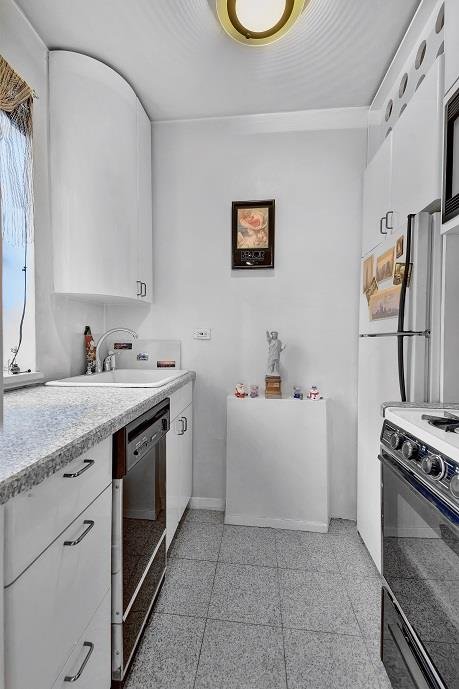 Há uma cozinha separada com janela, já atualizada, equipada com lava-louças e geladeira de tamanho padrão.
