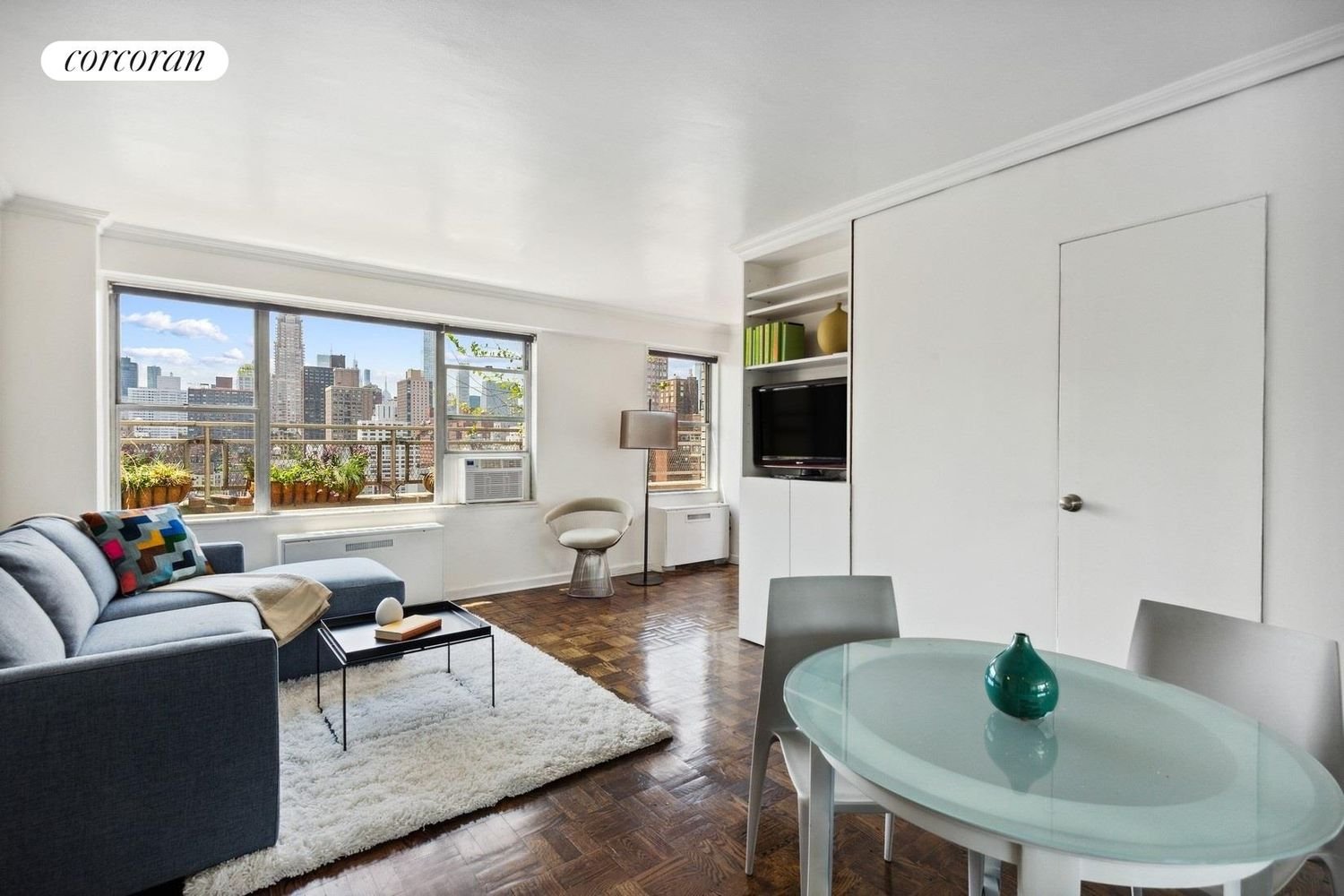 No interior, o studio de aproximadamente 525 sqft oferece uma cama de parede embutida de alta qualidade da marca Resource, posicionada em alcova, além de espaçosa área de sala e jantar.