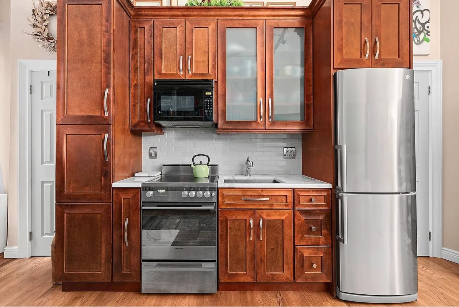 O apartamento possui piso de madeira, sancas, iluminação de trilhos, ventilador de teto, banheiro com janelas e espaço para refeições. A flexível área Open Living inclui uma estante embutida que se abre para desdobrar uma cama embutida com espaço suficiente para uma área de entretenimento e área de alimentação. A cozinha foi projetada com lindos armários personalizados e eletrodomésticos de última geração.