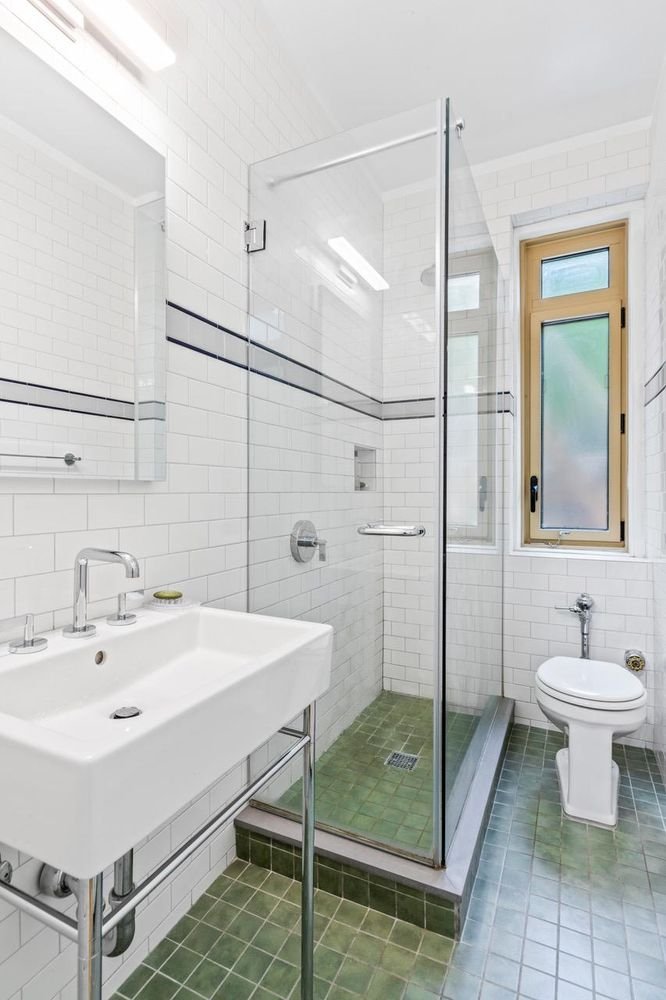 O banheiro reformado e envidraçado, com box de vidro, paredes de azulejos de metrô e piso frio, é simplesmente encantador. O Duravit em pé parece tão certo neste espaço cuidadosamente selecionado. O banheiro se transforma em uma área de vestir enorme que poderia facilmente funcionar como espaço de trabalho.