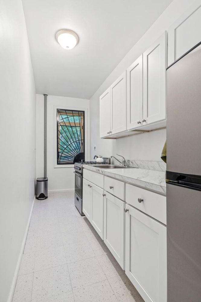 A cozinha recentemente renovada, com janelas, virada a sul, completamente separada do resto do apartamento, teve muito pouco uso. A linha Avanti de aço inoxidável nunca foi usada. Uma geladeira Avanti de aço inoxidável combinando completa os aparelhos.